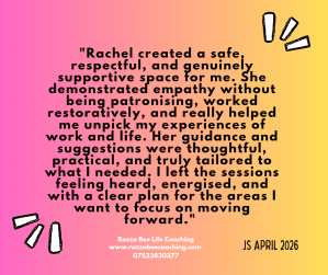 “I engaged Rachel’s services as I was looking for guidance to assess and set goals for the various areas of my life and make realistic and positive changes to move forward. Rachel is exceptionally gifted in teasing out barriers and gives much food for thought after a session. Her professional toolkit is wide and varied, and she is both unshockable and non-judgemental. I feel that Rachel is empowering me to develop new skills, change some limiting beliefs and reframe the challenging areas of my life. The services that she offers are incredibly positive and supportive, and she is particularly skilled in identifying the root of an issue and tailoring action accordingly. Cannot recommend her highly enough, especially if you enjoy having some fun along your journey!” – Feed back received from MF, July 2025