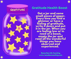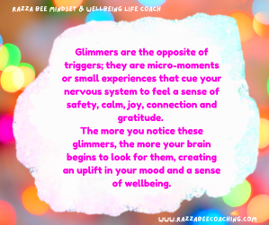 If you’d value some support and guidance in navigating and managing your emotions and finding your way to a life of gratitude and glimmers, please feel free to contact me on 07523830377 or email razzabeecoaching@gmail.com. You can also check out my website at one www.razzabeecoaching.com