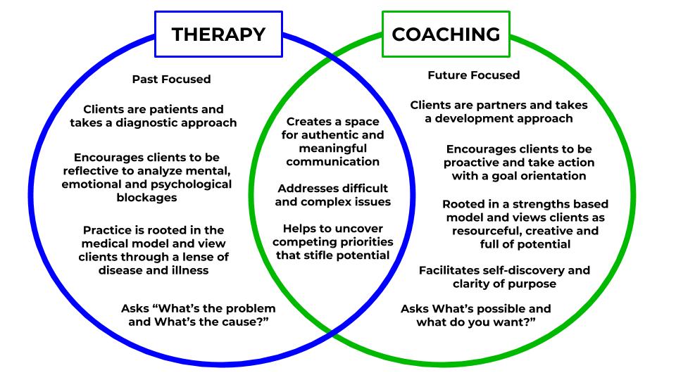 Coaching is not a substitute for counselling, directive advice or therapy. I am not a counsellor or therapist, and I will therefore not be providing you with counselling/therapy. I find the diagram below very useful to show the difference between the two. If you feel that counselling is what you need, then please speak to your GP or check out local counselling providers to you.