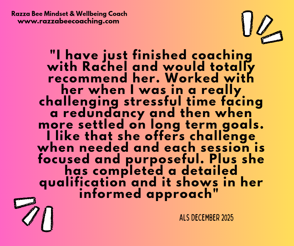 Hello, and welcome to Razza Bee Life Coaching. I’m Rachel and as a qualified Life Coach, I offer online Mindset and Wellbeing Life Coaching and Emotional Freedom Technique (Tapping) in Warwickshire and throughout the UK, as well as monthly Activity Challenges, supporting charities at the same time as keeping you fit.
